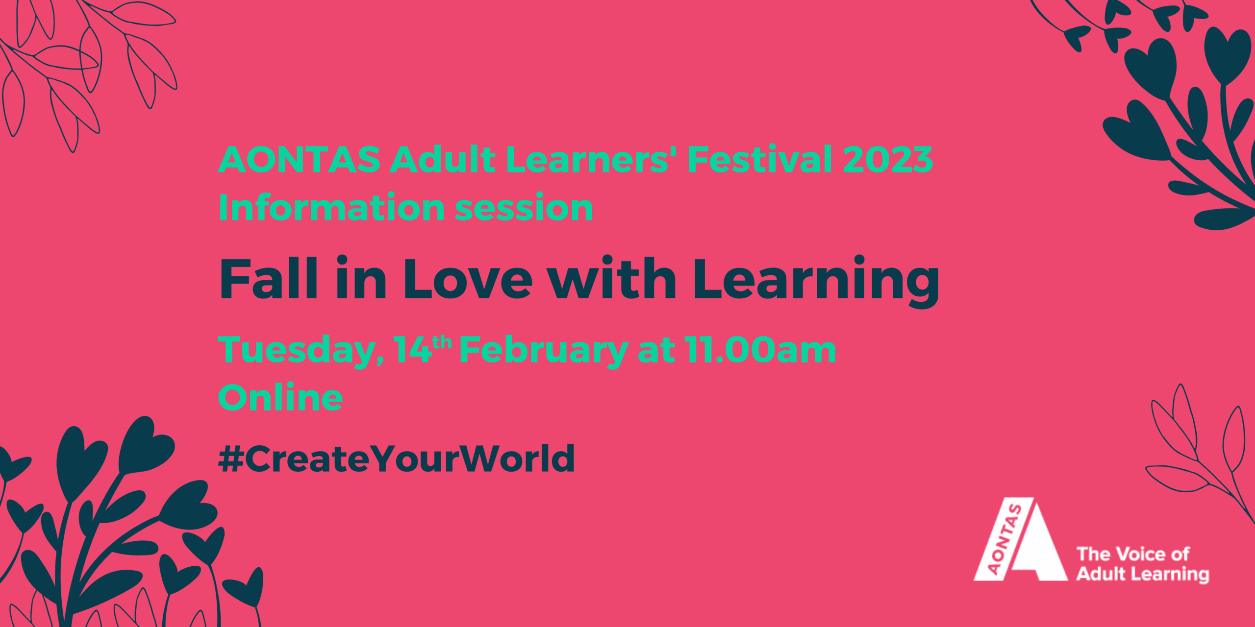 Join us online on Tuesday 14th February – Valentine’s Day – at 11.00am to find out how you can take part in the AONTAS Adult Learners’ Festival 2023.