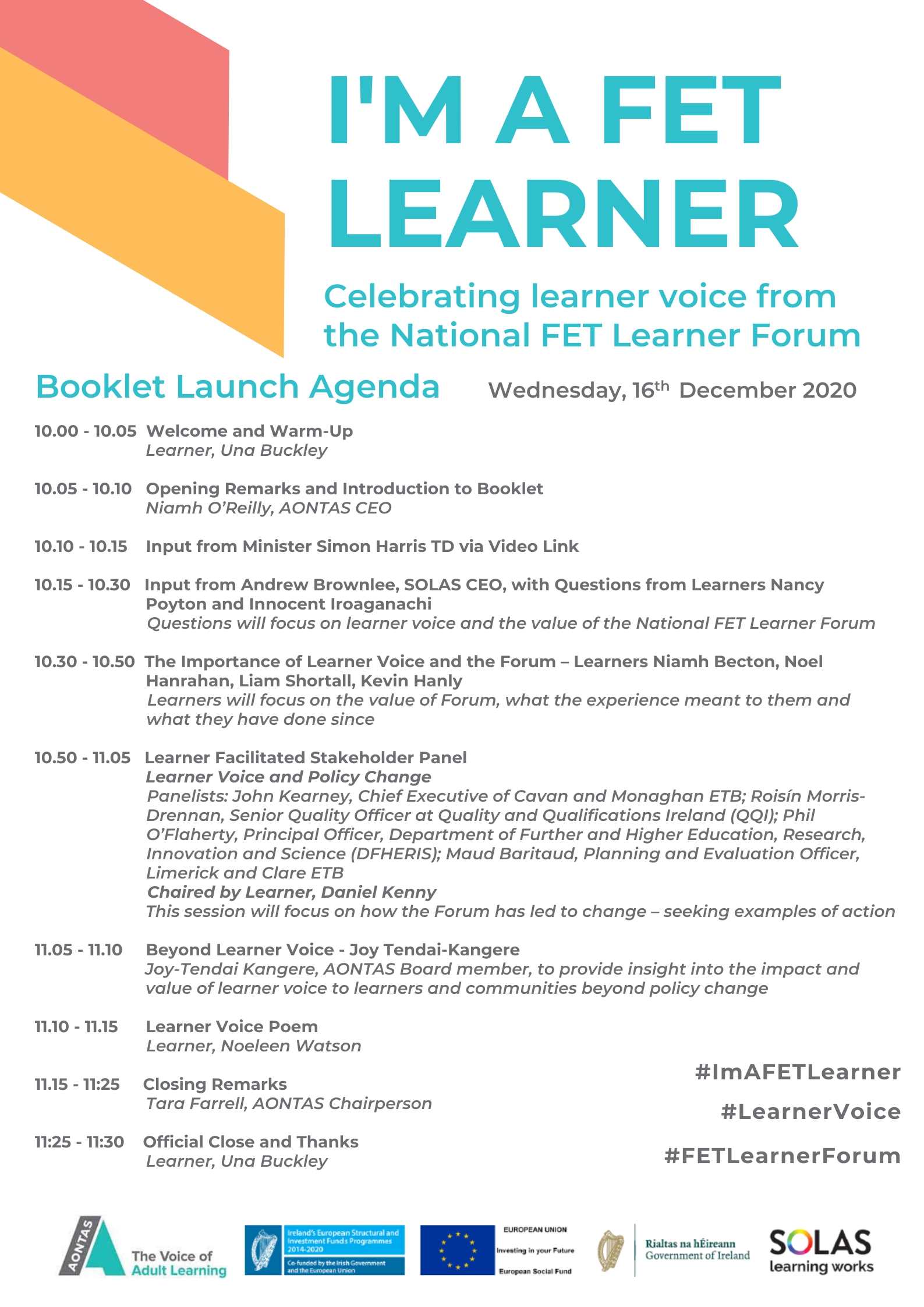 “I’m a FET Learner” is an AONTAS booklet capturing the experiences of ten Further Education and Training (FET) learners who participated in the National FET Learner Forum over the course of its existence from 2016 to 2020. The purpose of this booklet is to capture the individual impact of the Forum according to learners who have taken part. For many, the Forum is a stepping stone to further, deeper learner voice engagement. This event will celebrate the achievements of these learners and their contributions to the National FET Learner Forum and beyond. The event will be learner-led. It will also include a stakeholder panel discussion on the importance of learner voice in policy making and the value of learner voice in the Irish adult education sector.