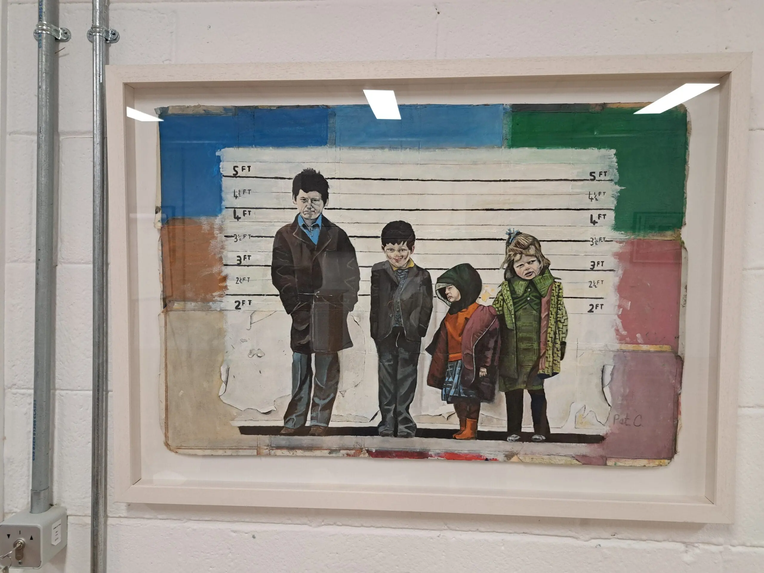 A particularly striking piece, “The Usual Suspects,” depicts young children in a police line-up.