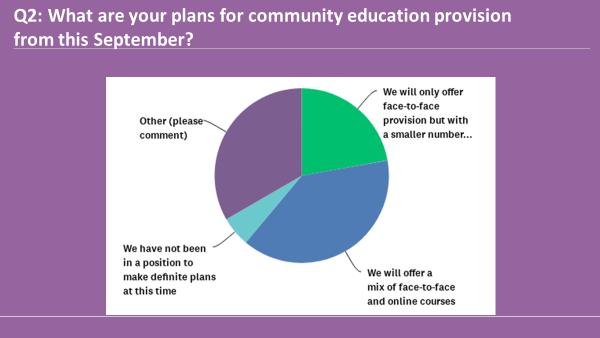 The recent findings provide AONTAS with a more robust record that can be used to determine where the organisation and our members now need to focus our collective attention. Similar to members’ main concerns in April the questions around adapting provision remained at the forefront of members’ minds. For example, the second question of the recent survey asked respondents ‘What are your plans for community education provision from this September?’: