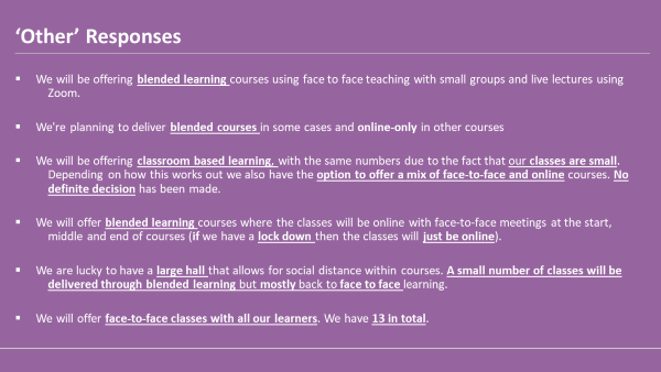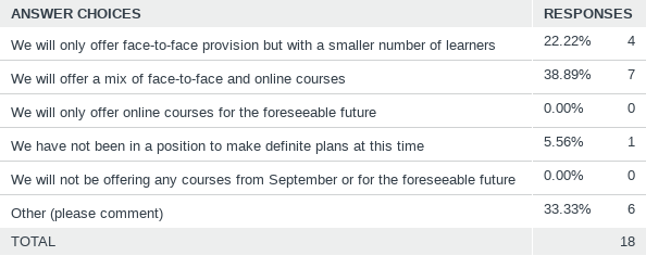 Depending on the organisation’s capacity and resources, the majority fell into two specific categories: offering blended learning or limited face-to-face. Interestingly, no respondents said that they will be halting provision come September which is a testament to the sectors commitment to ensure learners’ needs are met as much as possible given the circumstances.