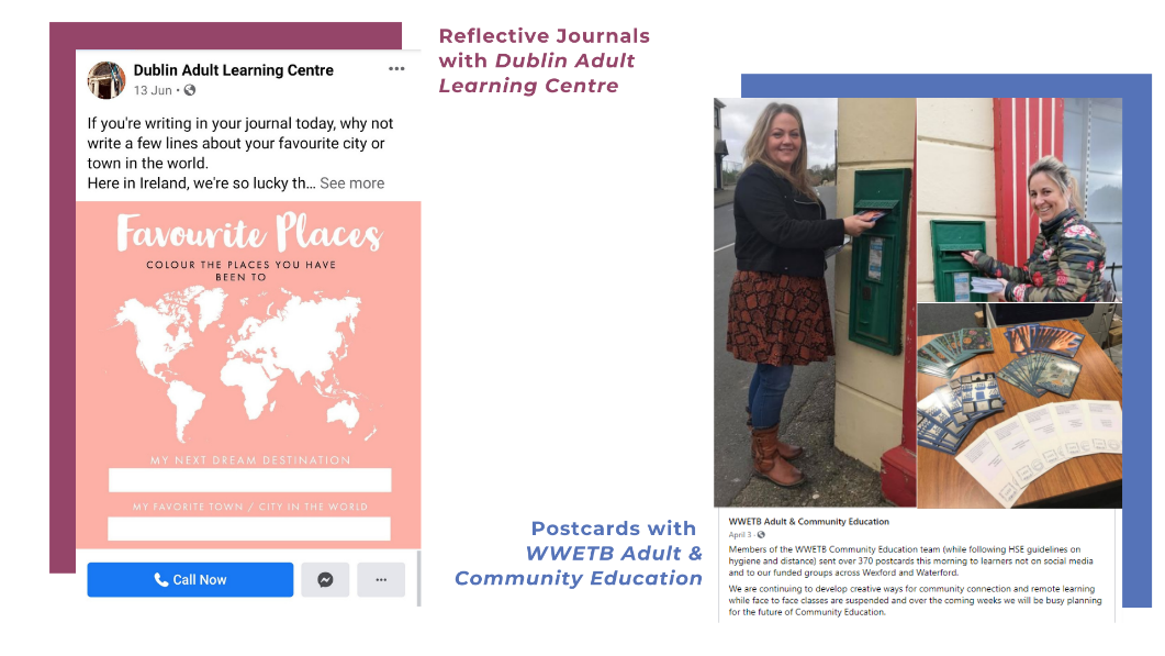 Dearbháil highlighted the innovation present in adult and community education organisations across Ireland, including in Dublin 8 Community Education Centre where each learner’s digital skills are prioritised as they enter their programme. Members have worked to build peer learning and engagement remotely. For example, Dublin Adult Learning Centre’s Reflective Journal activities have encouraged learners to complete writing tasks during the summer months while Waterford and Wexford Education and Training Board issued postcards to learners during the initial lockdown restrictions.