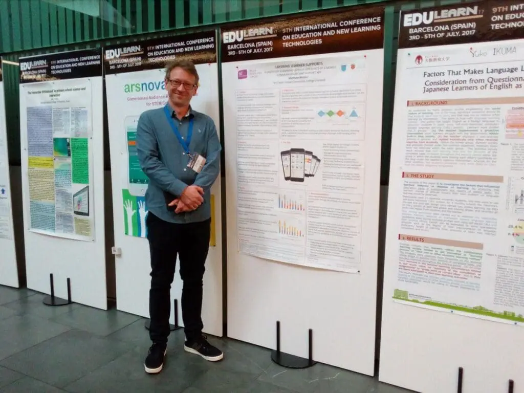 With my poster session scheduled early on the second day, I reluctantly missed the end of the keynote and found my way down to the communal breakout space filled with exhibitors and fellow poster presenters. After finding a spot that I liked between a German project on student feedback and a Japanese poster on language learning, I displayed my poster documenting my project on supporting VCC learners through a mobile support app.