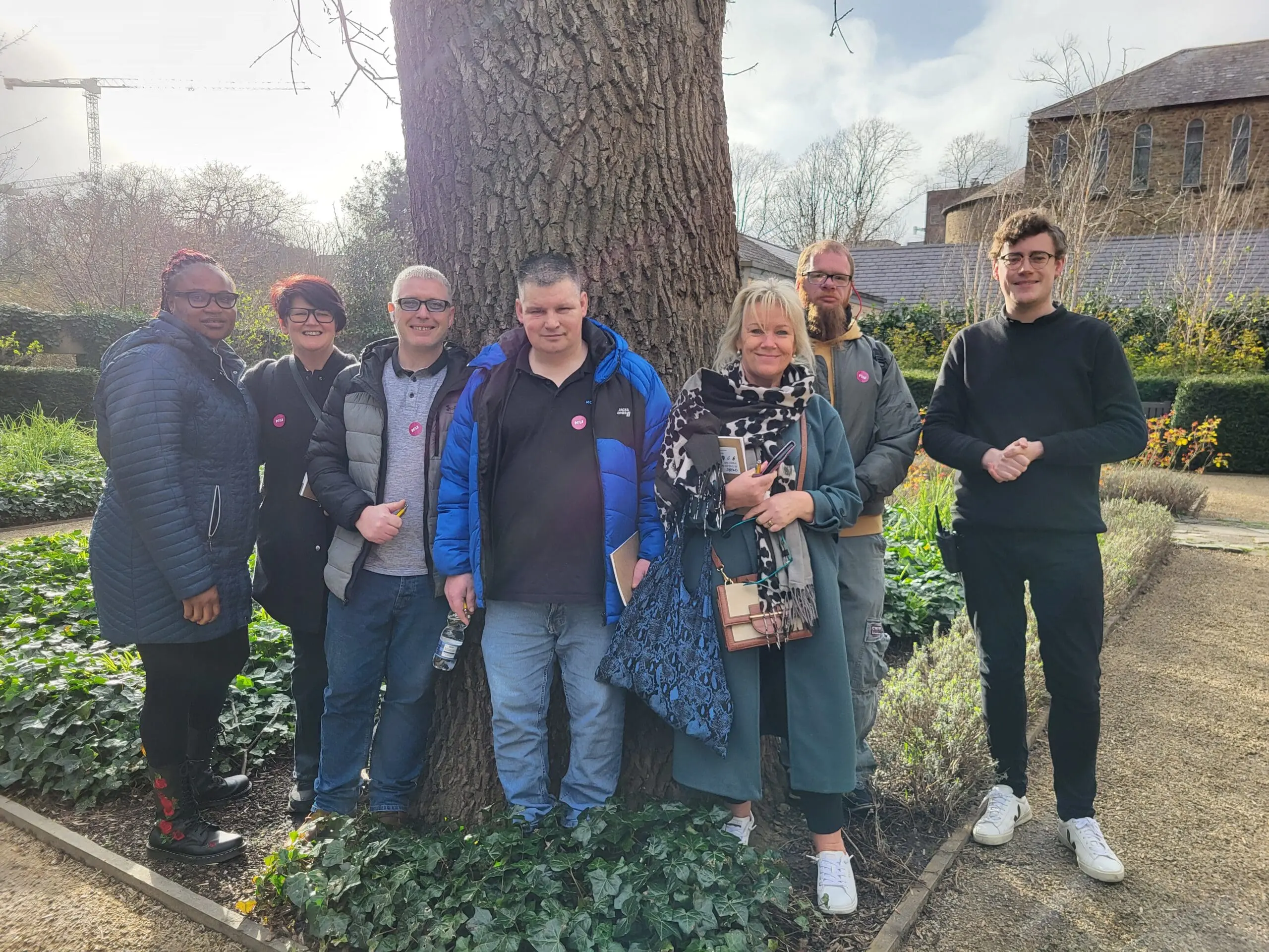 He showed us a photograph of one of the University’s most famous graduates, James Joyce, lounging against a tree with his classmates – and then pointed out the window to the Museum’s garden, where the self-same ash tree stands today. Naturally, that got us hooked. Not only was this a perfect place for a group photo, it was an instant point of connection between Irish writing of the past and the country we live in today.