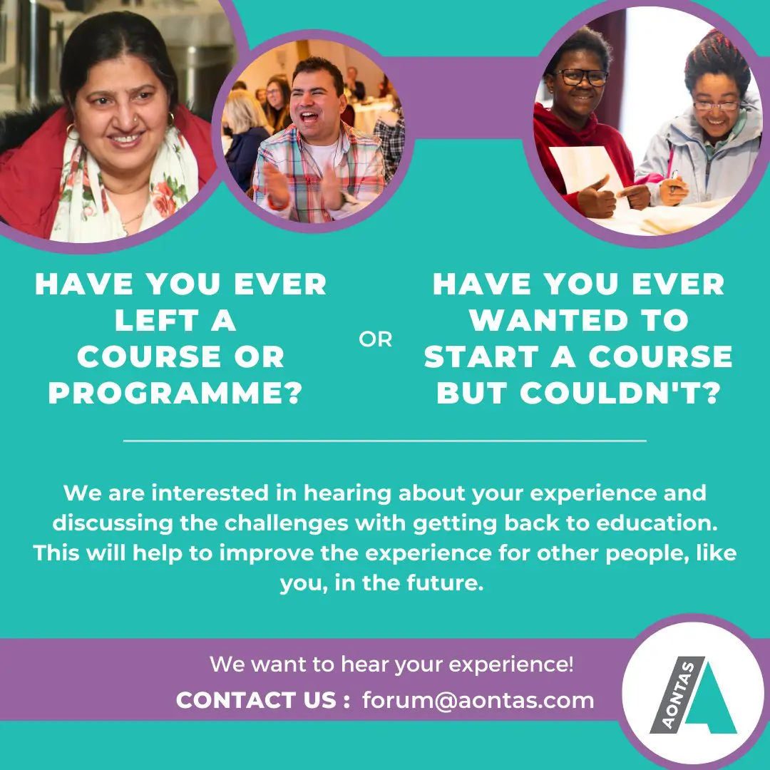 AONTAS is currently running a new research project called Lifelong Learning Participation, which involves holding discussion groups with people who have had to drop out of courses, or who have wanted to do courses but can’t or feel they don’t have access. If you’re an education provider working with learners and you’re interested in participating in our research and making a difference to society, contact forum@aontas.com.