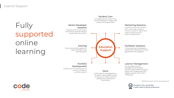 In short, the Code Institute provides learners with a Diploma in software development. This EQF Level 5 accreditation (QQI Level 6). The delivery and assessment is 100% online and is backed with robust learner support and learner progress metrics. It has been successfully delivered full-time over 16 weeks or part-time up to 52 weeks. Building learners’ self-confidence as much as their competences, are at the core of the organization’s offer. Employability also forms an important component. As Ciara mentioned, “it does work, but you have to convey to your learners that you are confident in their abilities, so you can be there for them for support throughout their experience of online learning”