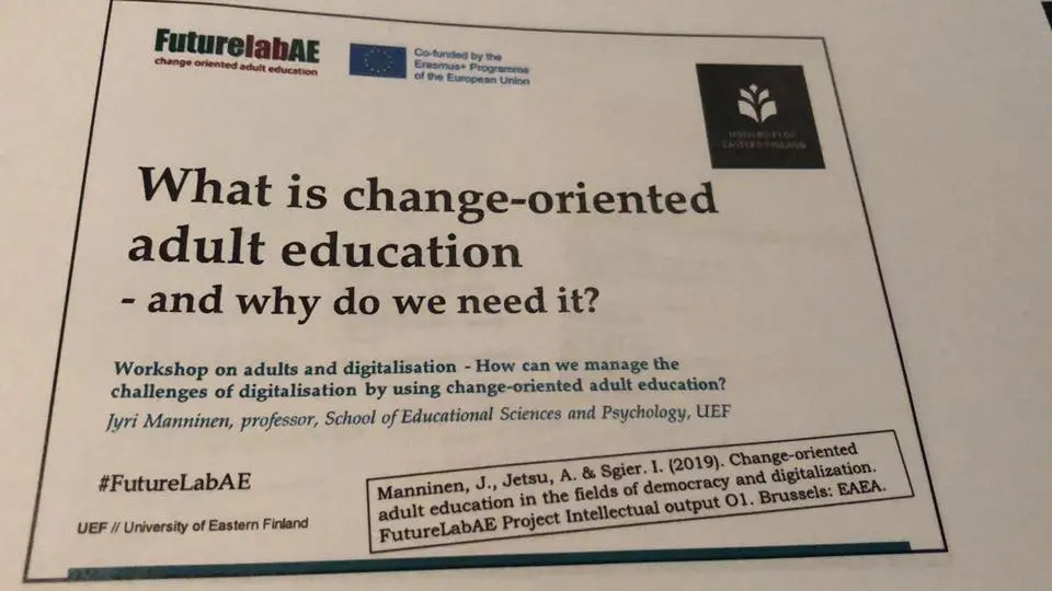 The workshop used a variety of interactive methods to explore what we mean by the term ‘change-oriented adult education’ and also why it is important for learners and providers as well as wider society. Critically, we are not just talking about an adjustment to an ever-changing society but also how we can actually shape and influence the societies that we need. The keynote presentation was expertly delivered by Professor Jyir Manninen, UEF.
