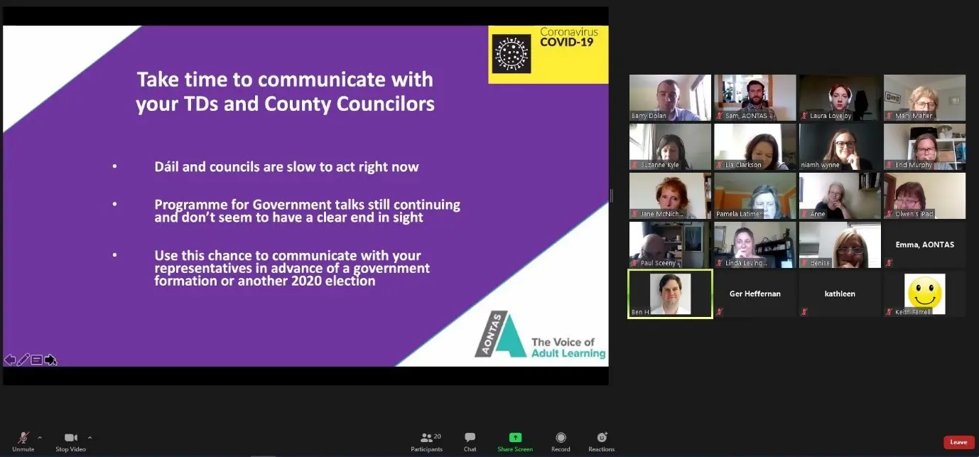 With attendance and interest levels from AONTAS members remaining as high as ever, last week saw AONTAS’ 10th Weekly Membership Update Webinar take place. The gathering saw AONTAS Advocacy Lead, Ben Hendriksen, discuss the importance of members leveraging the value of their vote and engaging with their local Teachta Dálaí (TDs) and Councillors. Ben went over some methods for doing this and shared a template letter that members could use to communicate to their local TDs in order to express concerns and place adult and community education on politicians’ . As government formation talks begin to crystallise and the next programme for government takes shape it is clearly now more important than ever to make sure that decision-makers are aware of how important adult and community education is to the daily life of local communities, especially in the lives of those who have been and will continue to be hardest hit by the current situation.