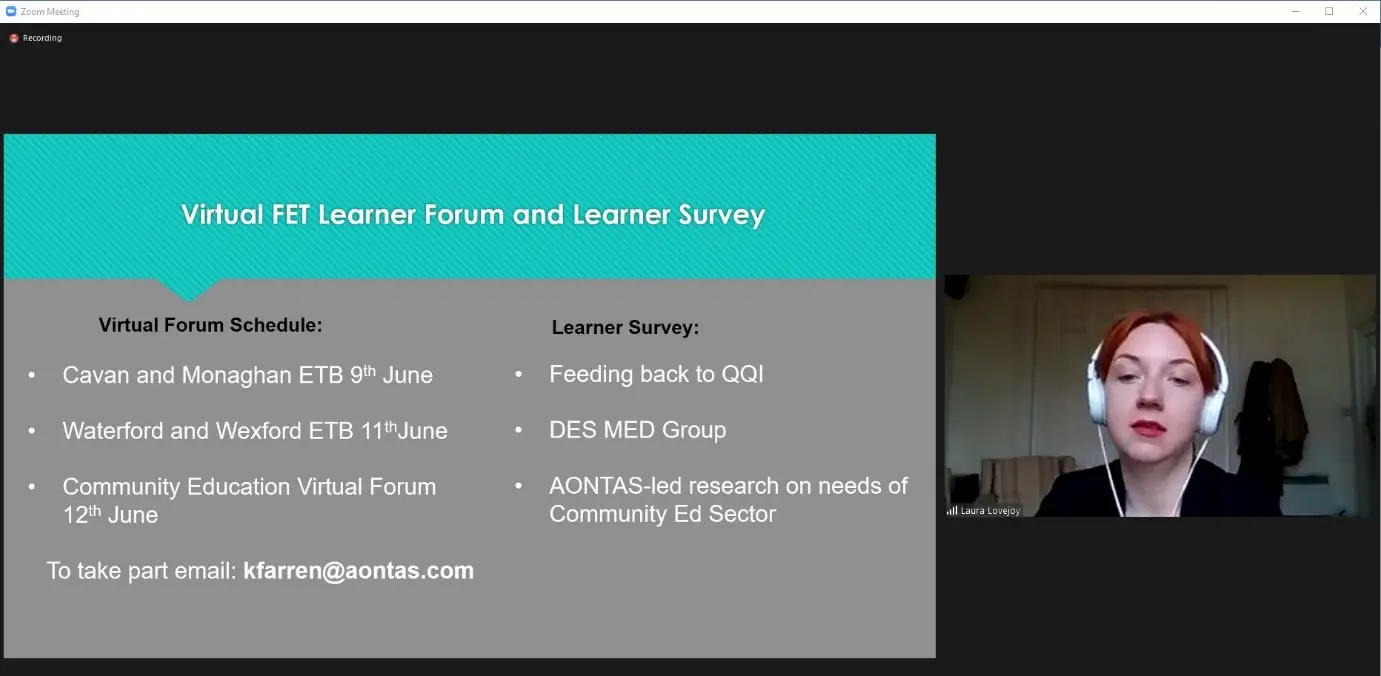 With the changes to learning that have occurred as a result of COVID-19, it is now more important than ever to listen to the experiences of adult learners in Ireland and to share #LearnerVoice. AONTAS Research Officer Learner Voice, , followed Mary’s presentation by drawing everyone’s attention to some key dates for upcoming Virtual National FET Learner Forum. She also spoke to webinar attendees about the online survey being used for engaging learner voice and how the results will be used as part of AONTAS advocacy work regarding QQI and the Mitigating Educational Disadvantage including Community Education during the COVID-19 Crisis Working Group (MED Group).