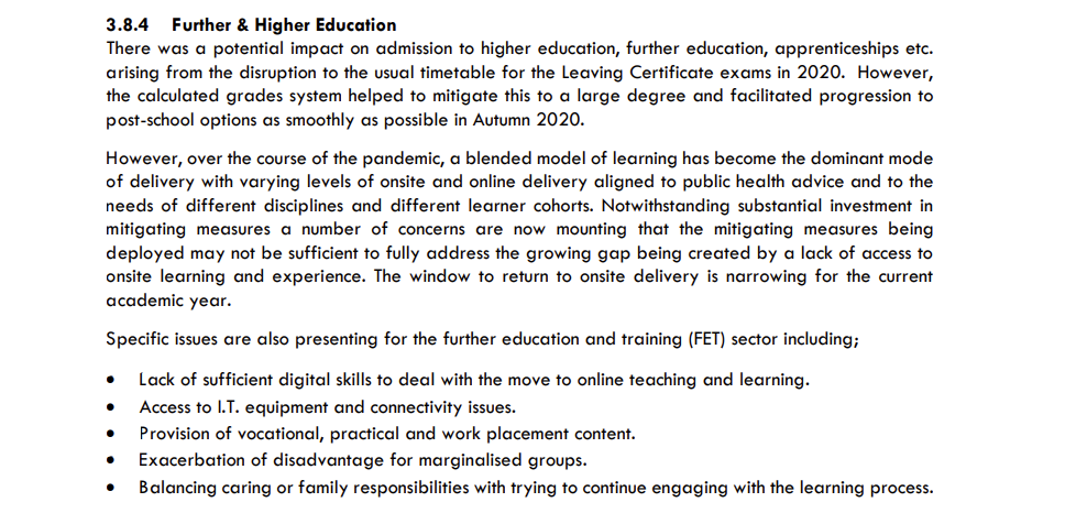 It is important to note that issues facing Further Education and Training (FET) and, indeed, community education learners are outlined, and there is a recognition of the “exacerbation of disadvantage for marginalised groups”. Additionally, the essential role of the community and voluntary sector is also named in the Path Ahead, highlighting the importance of community education in supporting disadvantaged communities during the pandemic. Action is required to address this issue and build on the potential of community education.